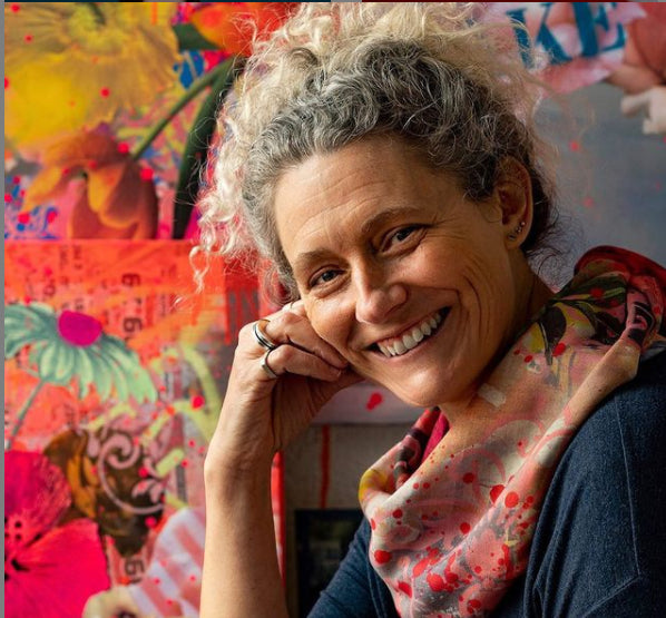 After sharing some of her work on instagram, mid lockdown, the feedback was so positive that she is now committed to creating art full time from her studio in Gloucestershire, alongside her wedding & event work. With an obvious love and passion for all things floral Jules’ artwork blends the beautifully romantic side of florals with the grittier side of urban art and graffiti references. Her work is a colourful, yet edgy juxtaposition of the two, combining collaged, stencilled, painted and photographic elements.