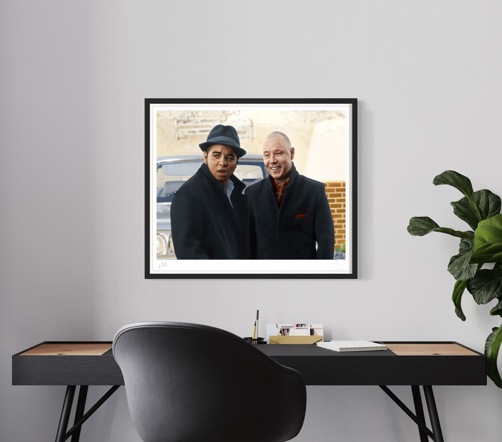These pieces have all been painstakingly composed from frames from the film rather than stills or photographs, using multiple frames to compose each piece. The image quality of the frames I captured in terms of resolution wasn’t great, so the work involved was immense. I spent spent around 8 weeks composing the pieces, creating the artwork and then the colour visuals. This is all before hand painting the final pieces, of which Shaun was the first to be completed. The frame used for Shaun is Shane’s favourite frame in the whole film, so I thought that was good place to start.