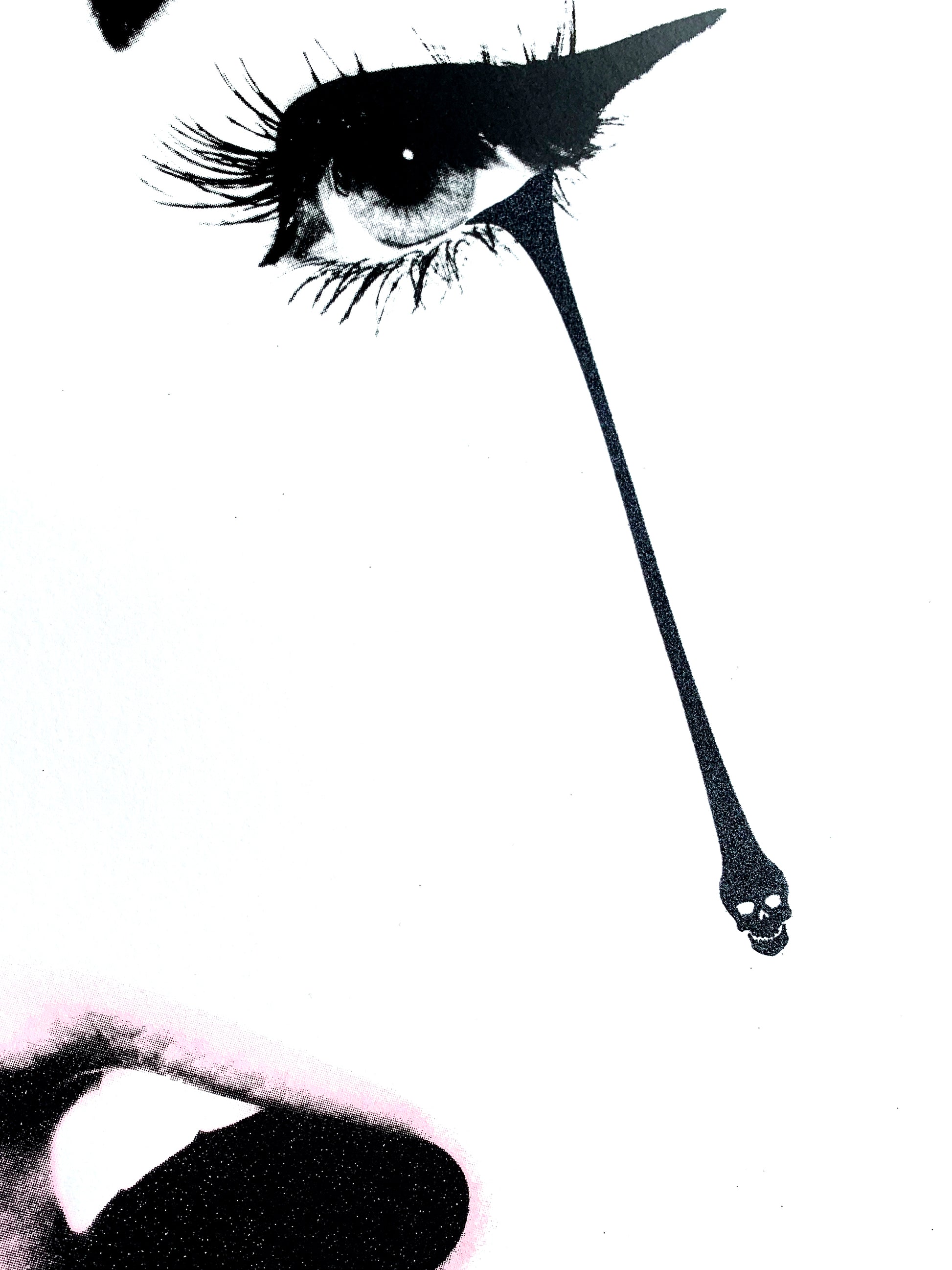 Medium: 2 colour screen print with a hand finished black glitter skull tear