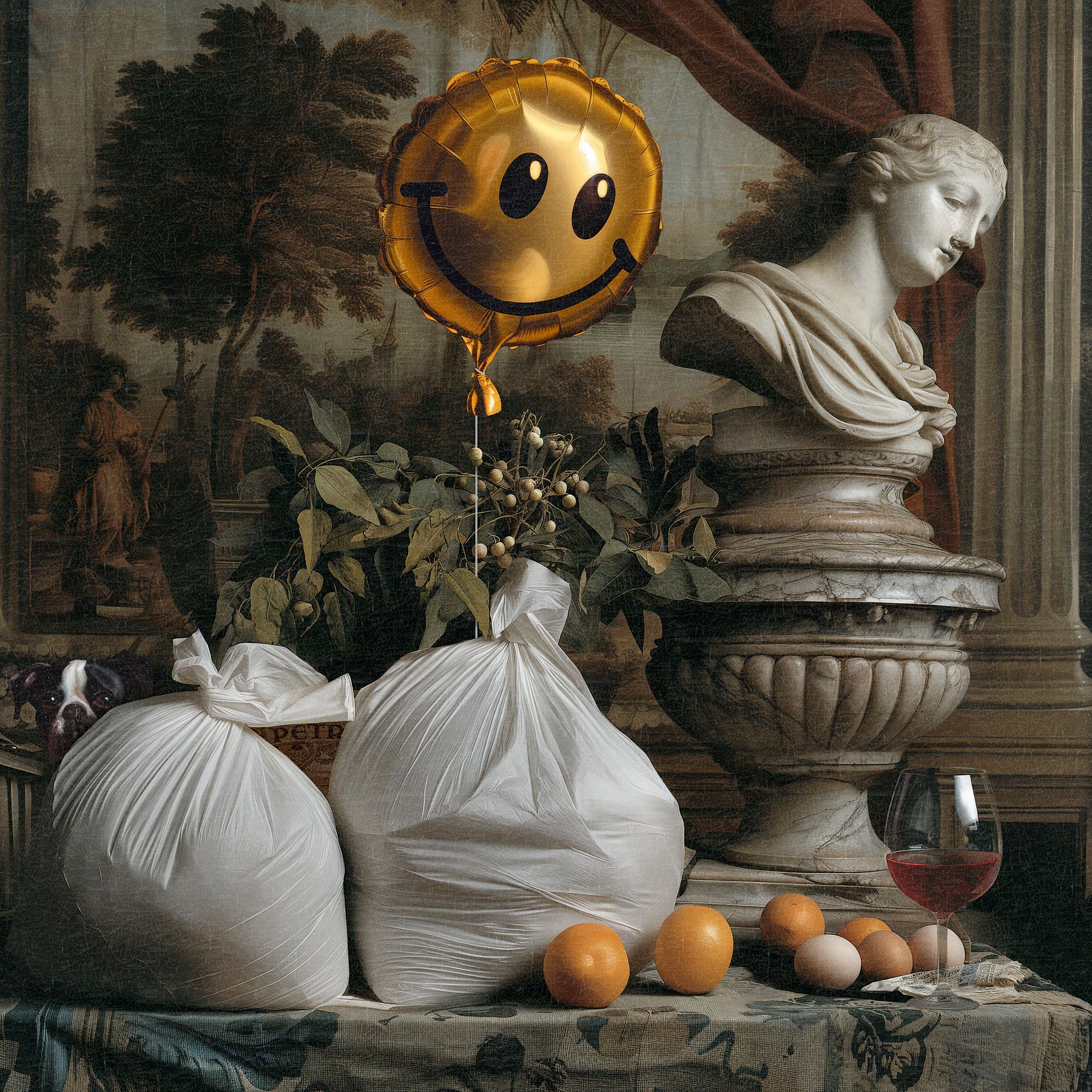 By offering modern takes on old masterpieces and transforming items typically associated with violence into delicate works of art, Gjoen challenges our preconceived notions of beauty. In this humorous piece, Gjoen has juxtaposed a classical still life scene with signs of thoroughly modern debauchery.
